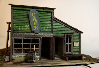 I attempted to distress the timber as much as I could but the hard ply material doesn't lend itself to this treatment very well, unlike basswood. Anyway after scraping until I got bored I weathered all the wood with weak washes of black and brown aniline dyes diluted with isopropyl. I then started the construction phase as per the instructions. I will add some interior detail that may just be visible through the large front windows. Perhaps I'll model it with builders going in and out on a refurbishment job, that might give scope for some detailing fun.![]() |
